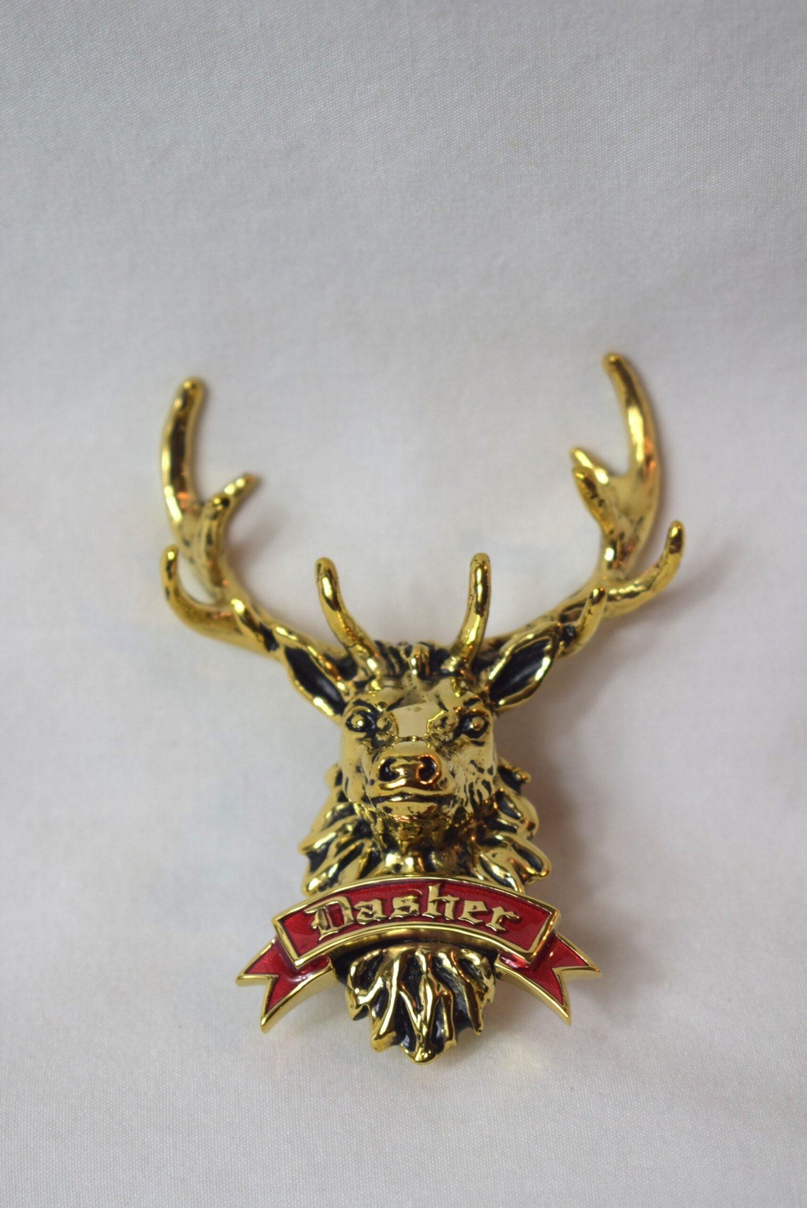 Hampton Roads Santa Claus and Santa Billy Exclusive!! Brass Dasher Brooch with red rocker. Pin measures 3 in tall and over 2 in across, secure 2 pin backing. This quality pin looks great. Priority shipping included.