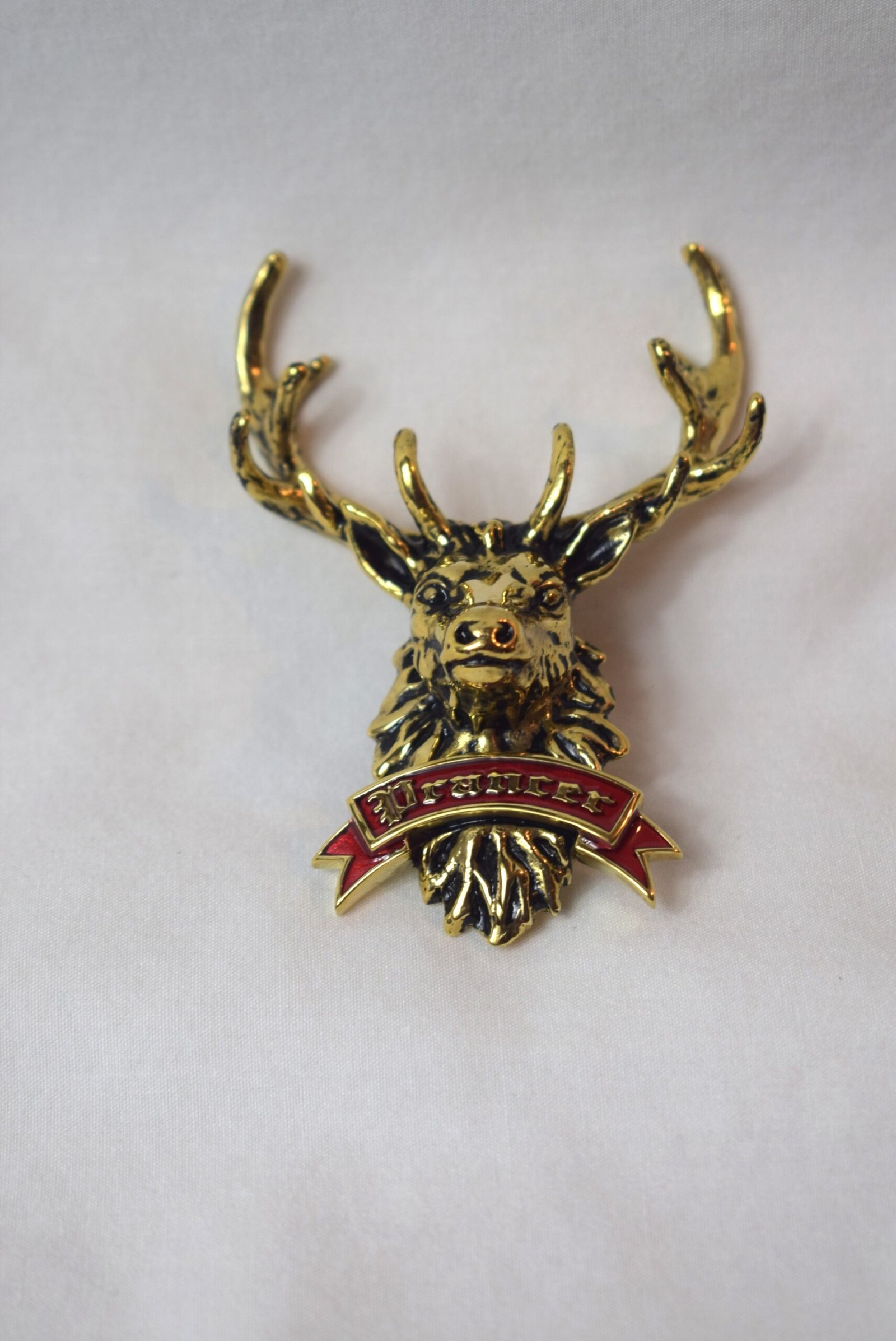 Hampton Roads Santa Claus and Santa Billy Exclusive!! Brass Prancer Brooch with red rocker. Pin measures 3 in tall and over 2 in across, secure 2 pin backing. This quality pin looks great. Priority shipping included.