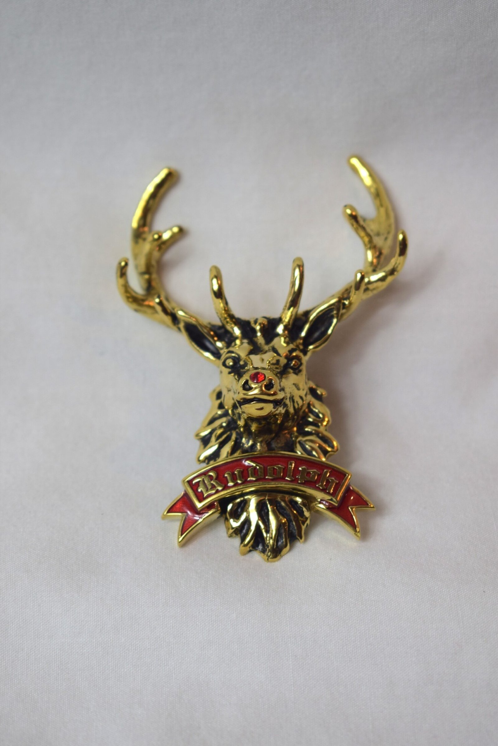 Hampton Roads Santa Claus and Santa Billy Exclusive!! Brass Rudolph Brooch with Red crystal nose and red rocker. Pin measures 3 in tall and over 2 in across, secure 2 pin backing. This quality pin looks great. Priority shipping included.